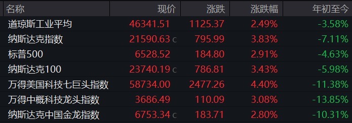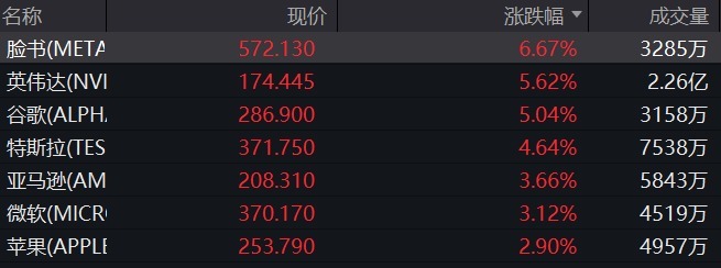 大型科技股普遍反弹,Meta涨超6%,谷歌涨逾5%,特斯拉涨超4%,亚马逊、奈飞、微软涨超3%,苹果涨超2%。
